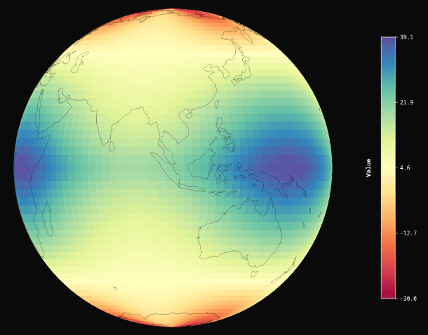 values = 30 - 50 * np.abs(lats_grid) / 90;values += 10 * np.sin(np.radians(lons_grid) * 3) * np.cos(np.radians(lats_grid) * 2)