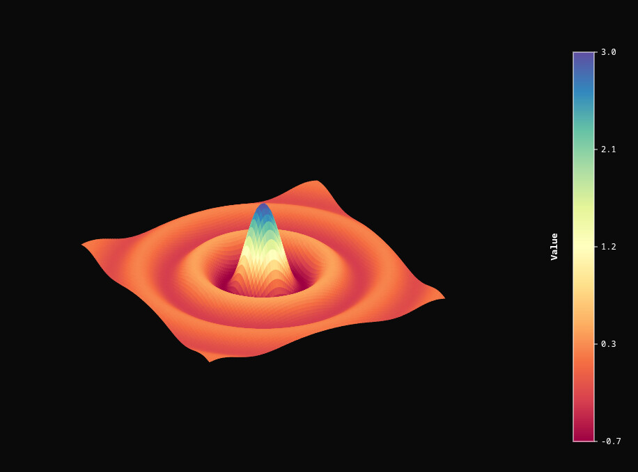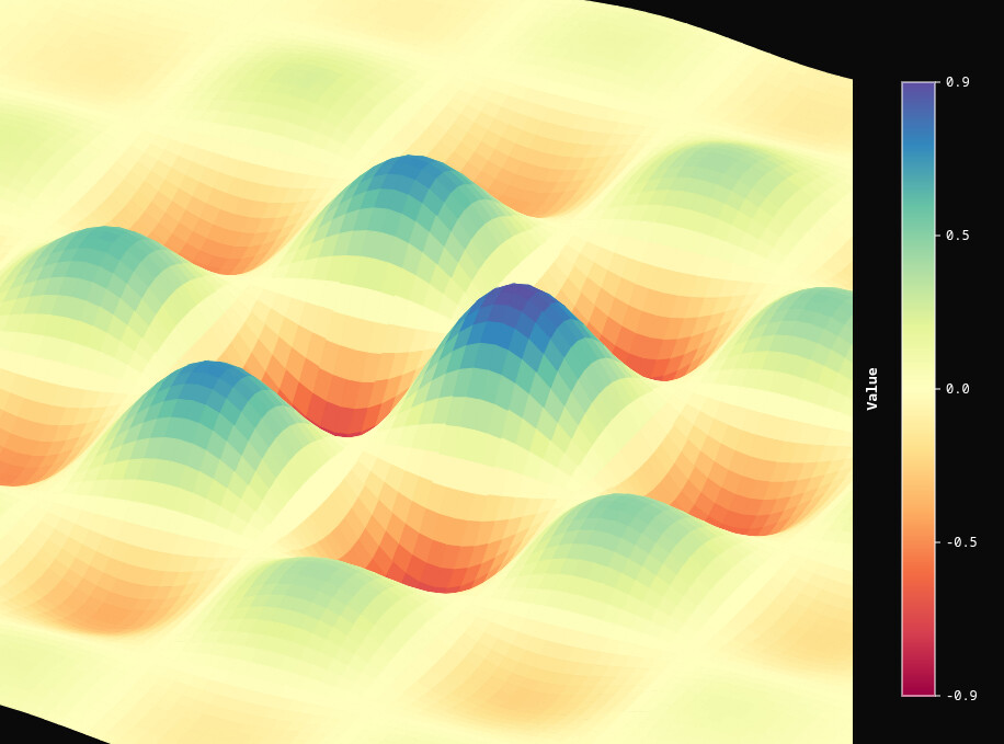 A custom BokehJS extension bringing true 3D surface visualization to Bokeh for the first time. Features painter’s algorithm depth sorting, mouse-controlled rotation/zoom, auto-rotation, integrated colorbar, hover tooltips, and support for 30+ color palettes. Handles complex parametric surfaces (hearts, roses, helixes) and mathematical functions with stable projection that prevents visual distortion during rotation.
