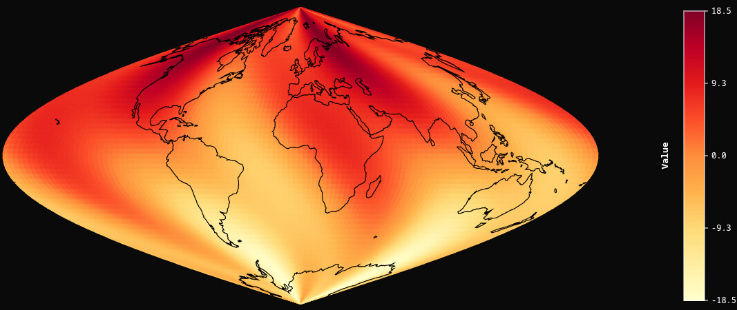 land = 5.0 * np.cos(2.5 * _lon_r) * np.cos(1.8 * _lat_r) # zonal "continent" warmth