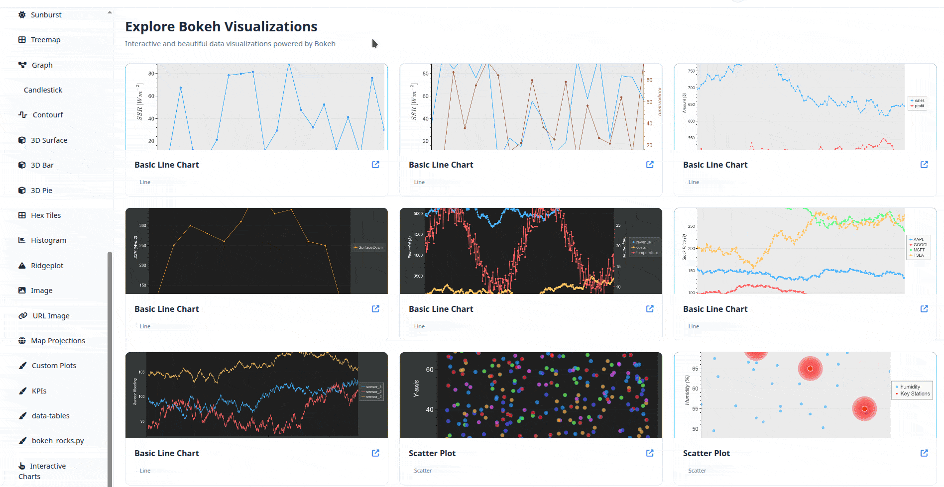 A curated collection showcasing what’s possible with the powerful Bokeh, featuring both high-level helper functions and low-level, fully customizable open-source examples. Most of the examples have been published separately here.