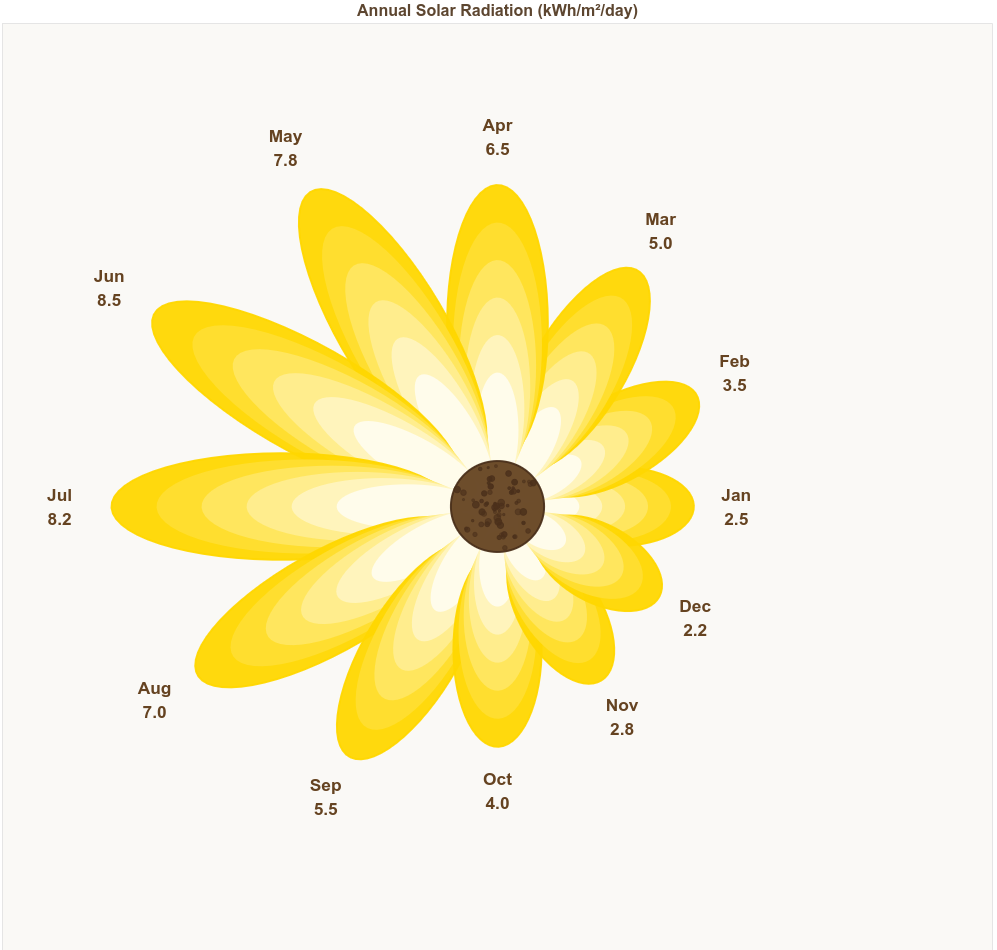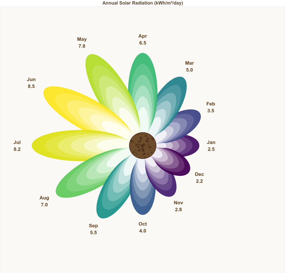 solar = [2.5, 3.5, 5.0, 6.5, 7.8, 8.5, 8.2, 7.0, 5.5, 4.0, 2.8, 2.2]