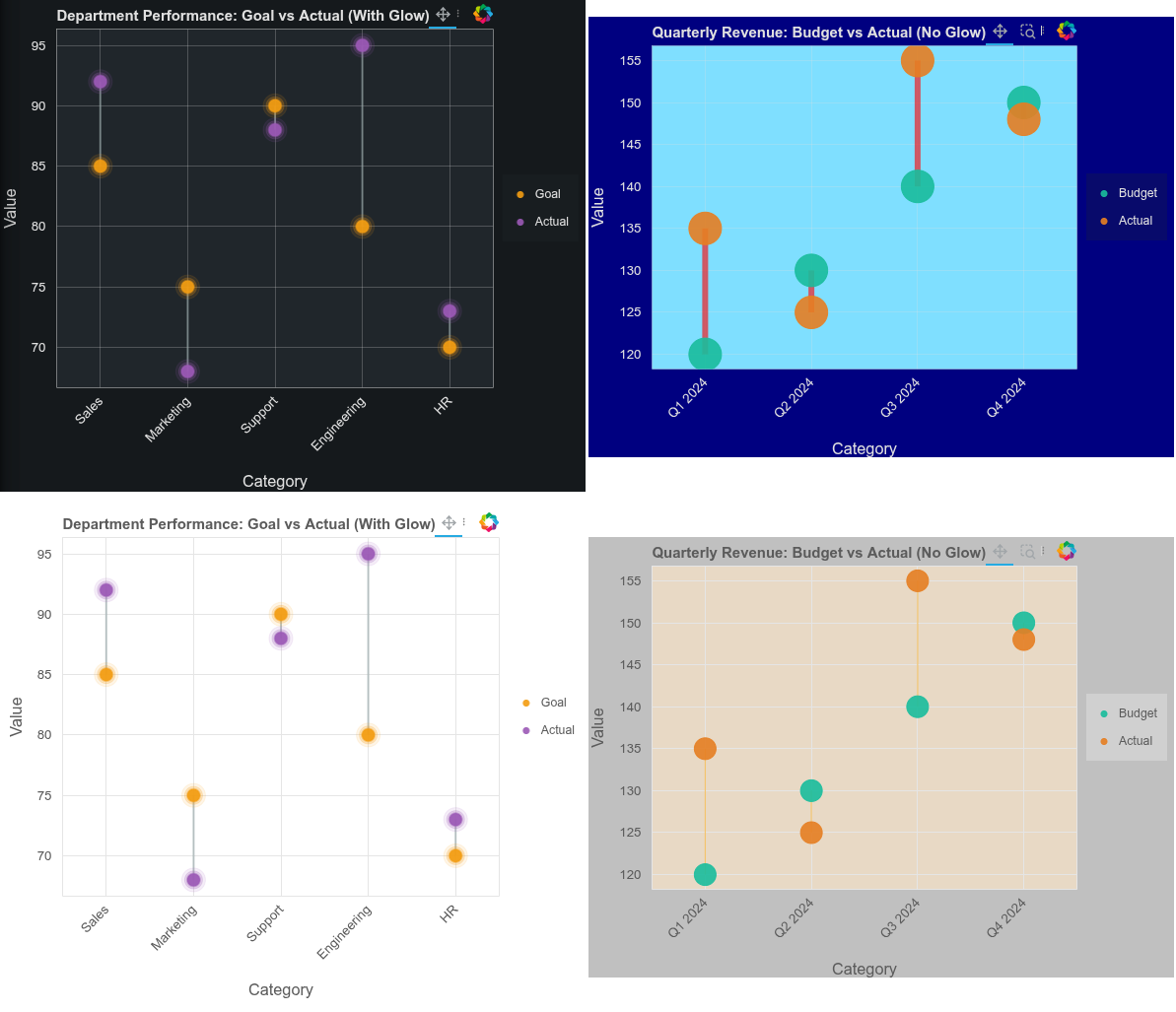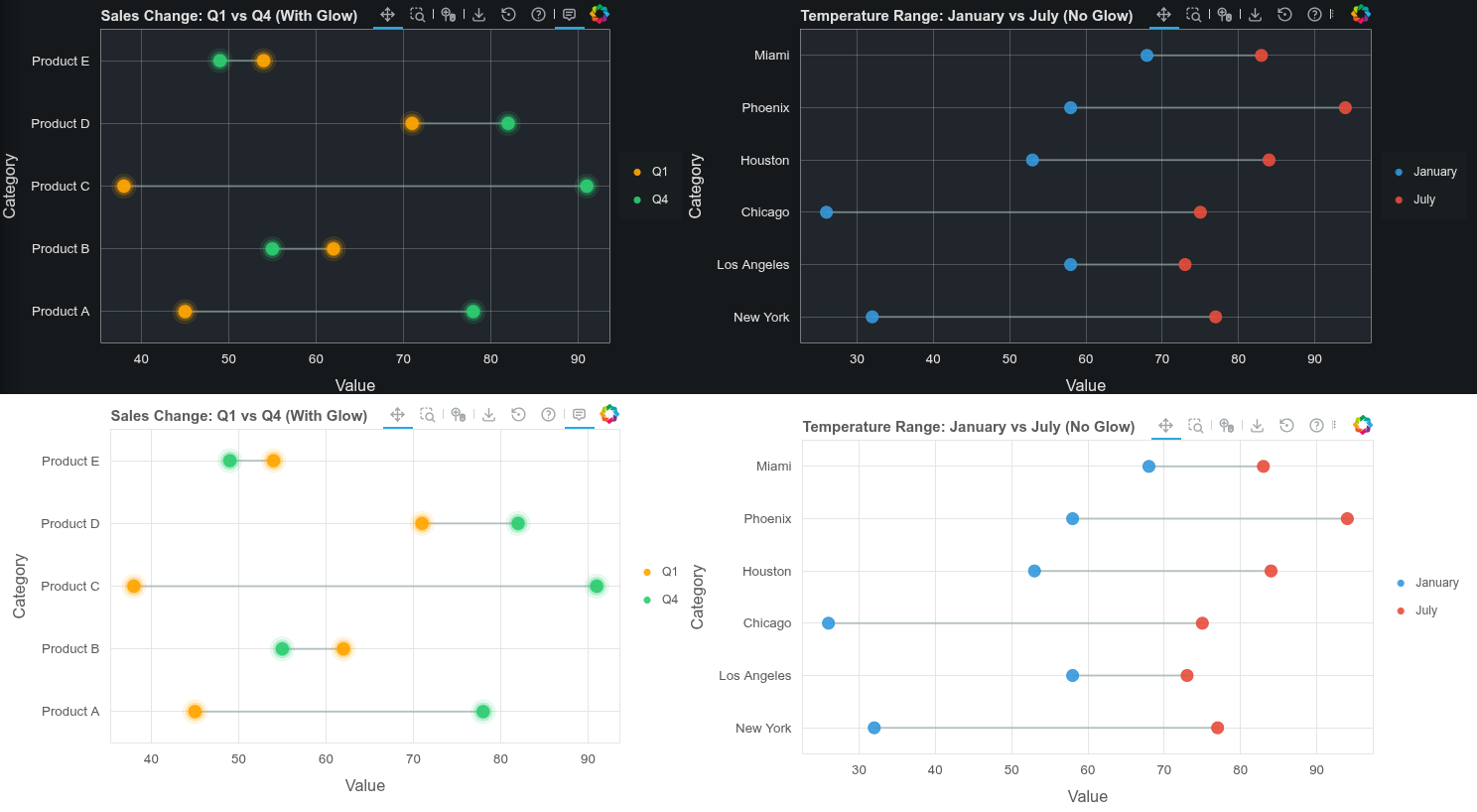 Dumbbell plots visualize change between two data points with connecting lines. Features include flexible orientation, adjustable point sizes, line widths, and optional glow effects.